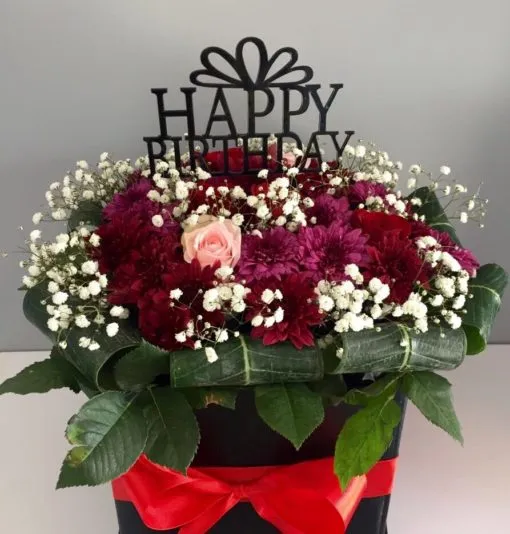 - Featuring chrysanthemums, roses and some stems of gypsophila beautifully arranged in a box with a Birthday topper.