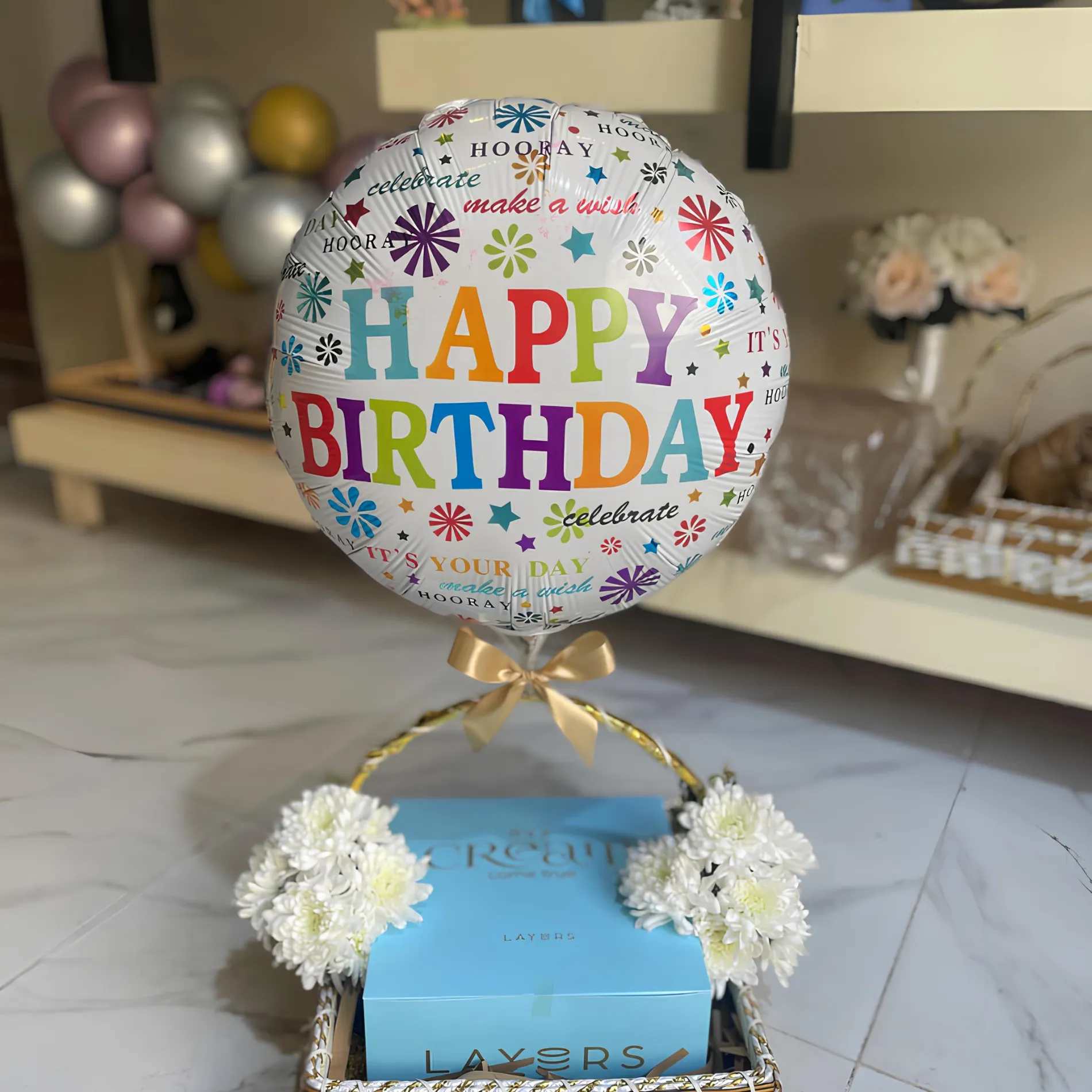 – Basket decor with cake and balloon